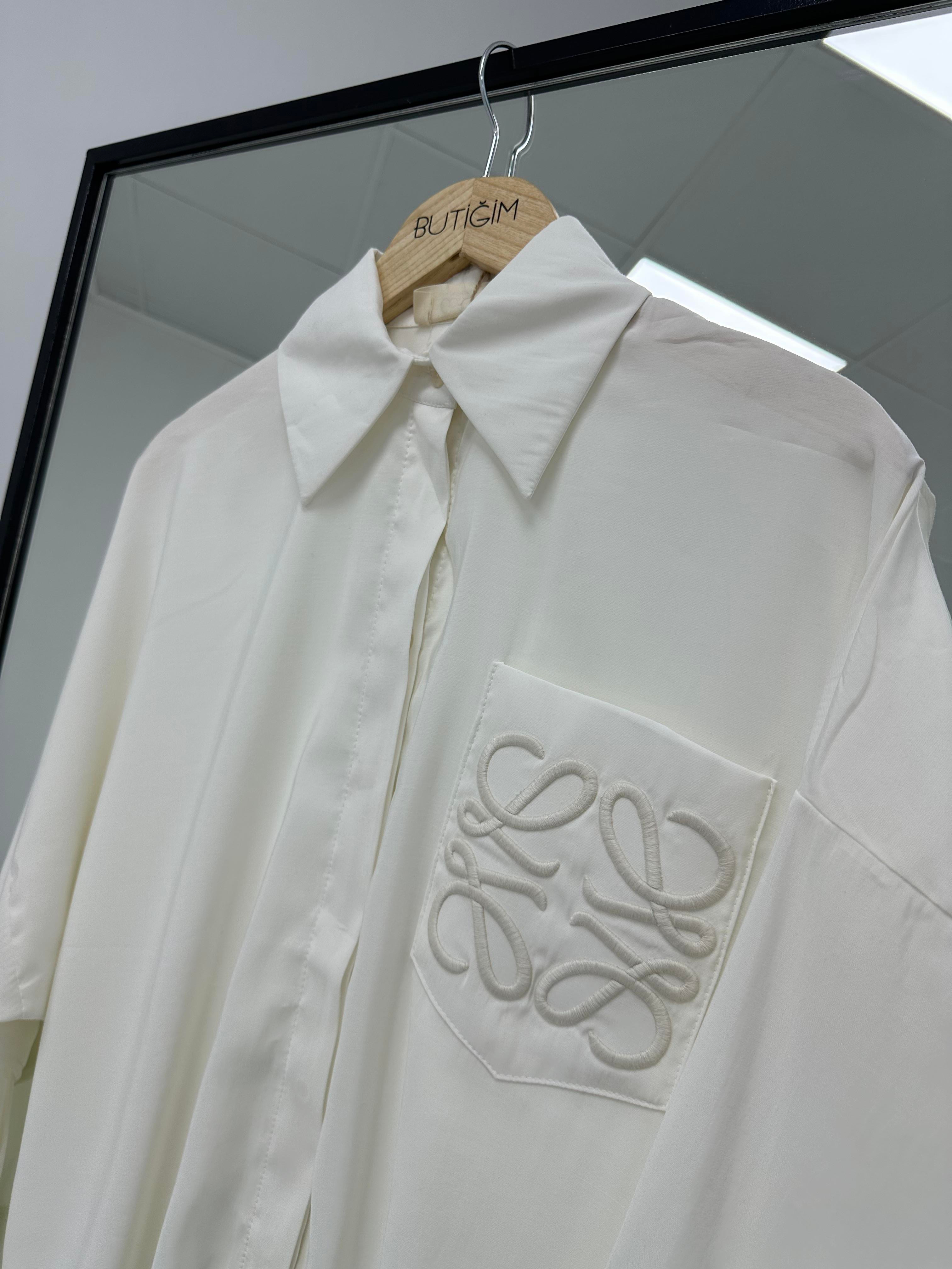 Cep Nakışlı Beyaz Gömlek