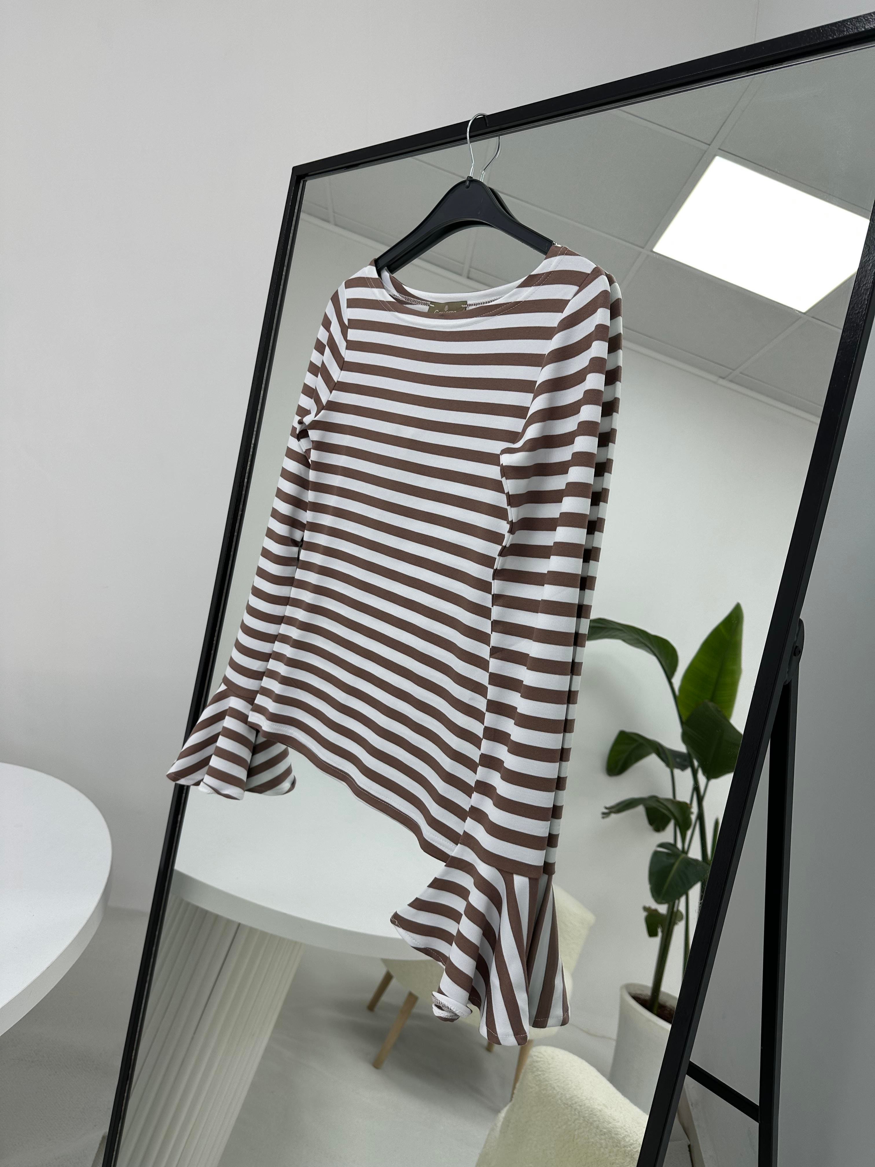 Kol Volan Detaylı Kahverengi Çizgili Bluz