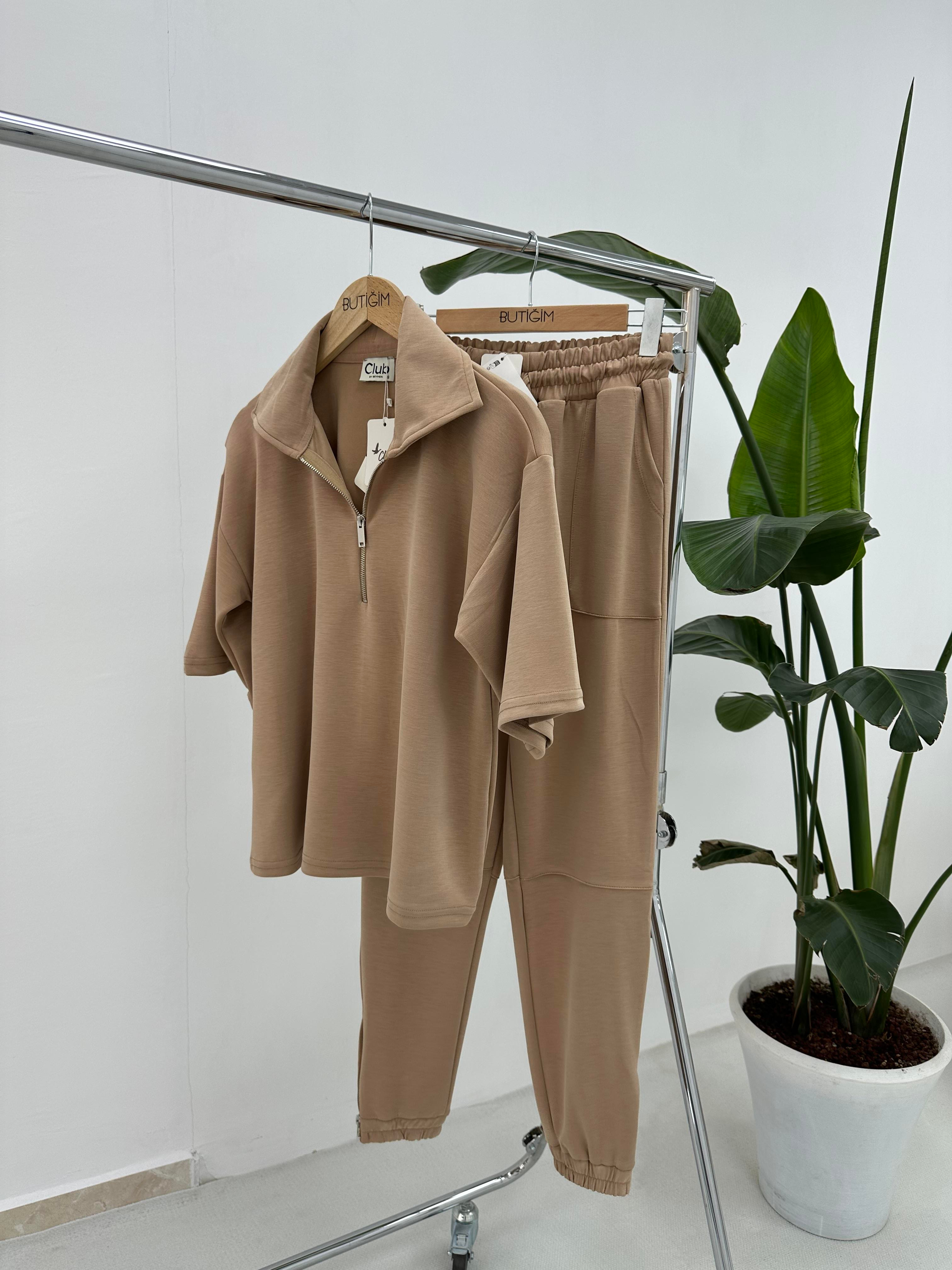 Premium Modal Kumaş Yarım Fermuarlı Camel Takım