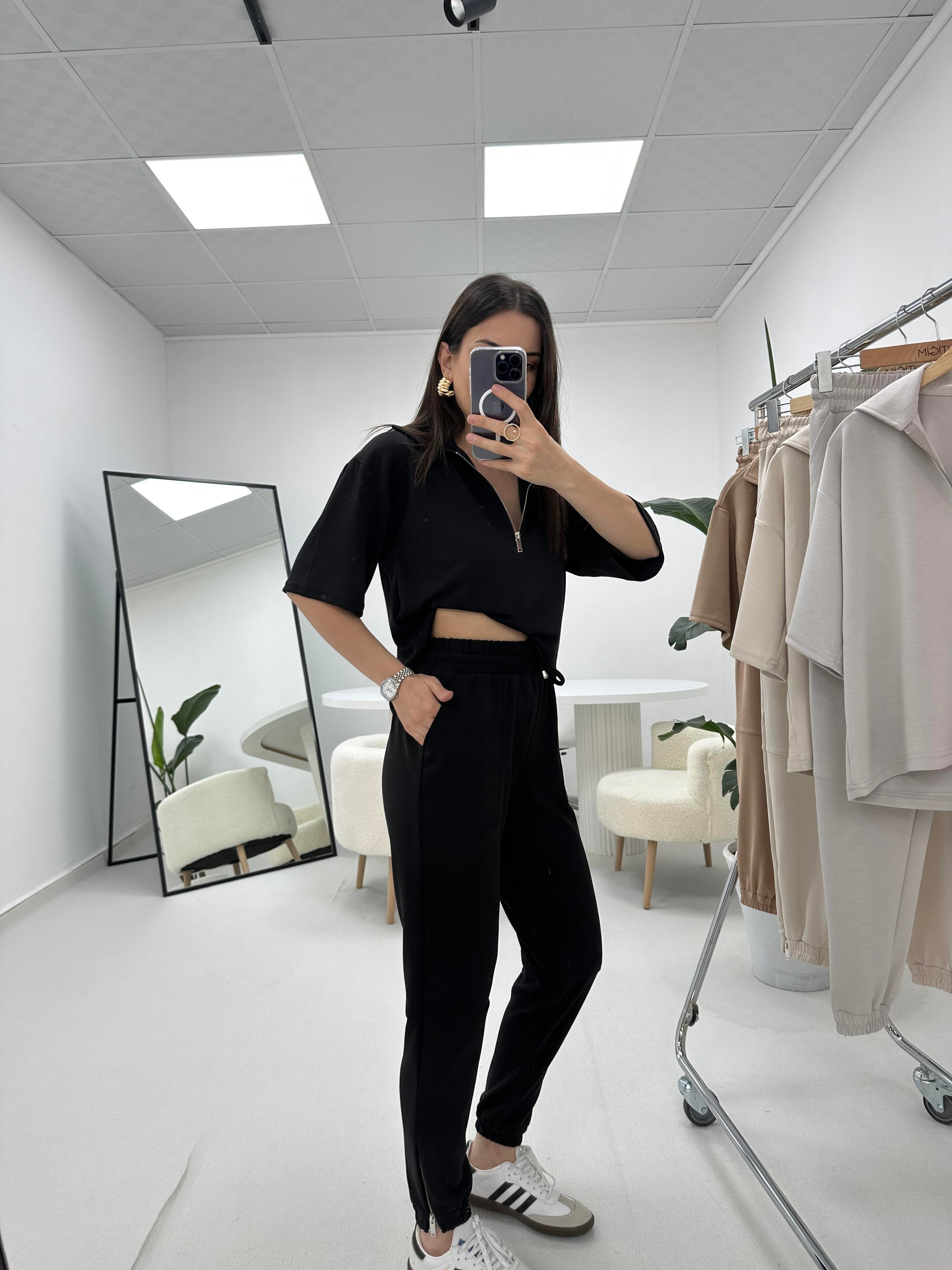 Premium Modal Kumaş Yarım Fermuarlı Siyah Takım