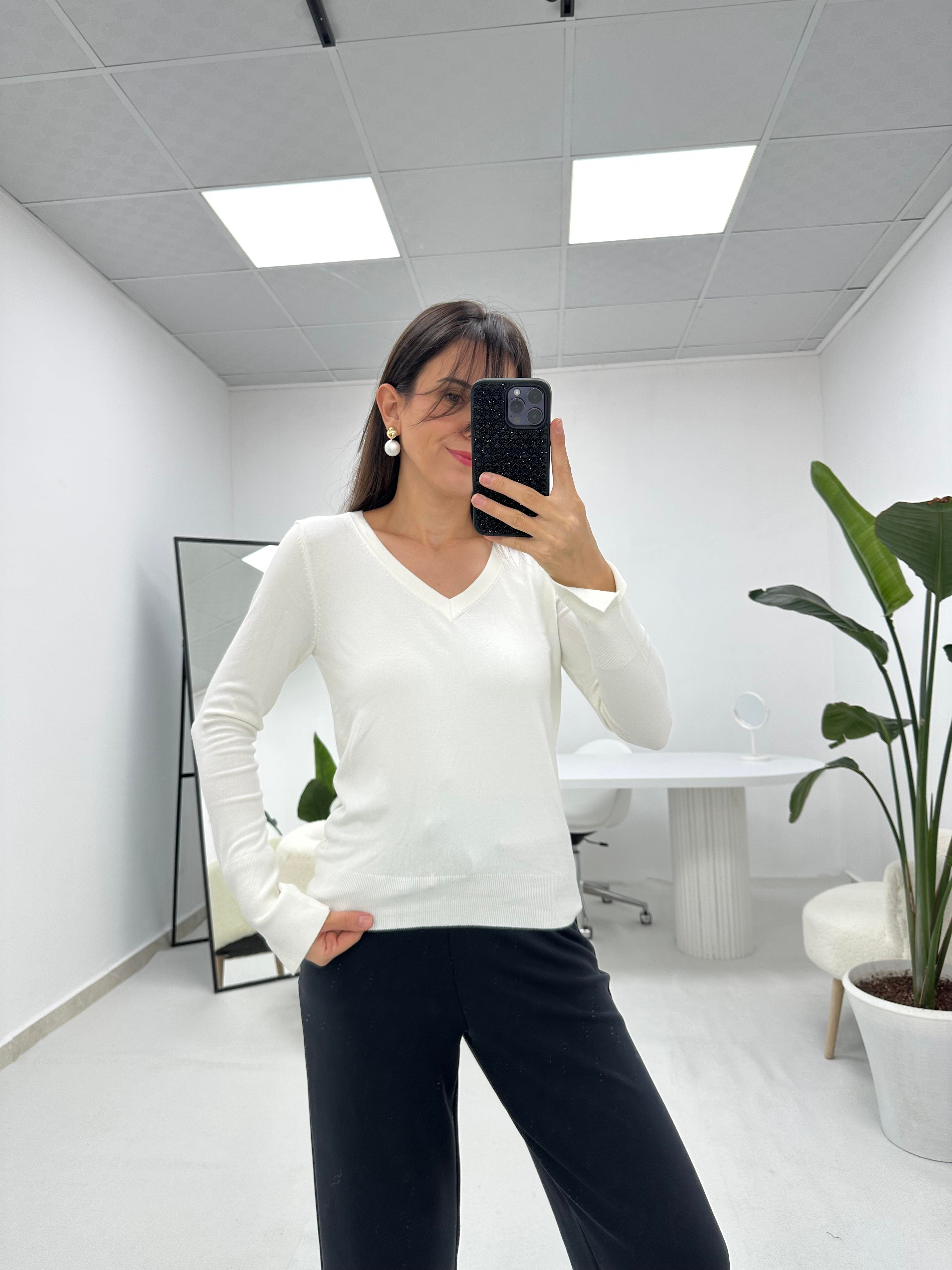 V Yaka Kol Detaylı Beyaz Triko Kazak